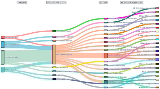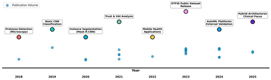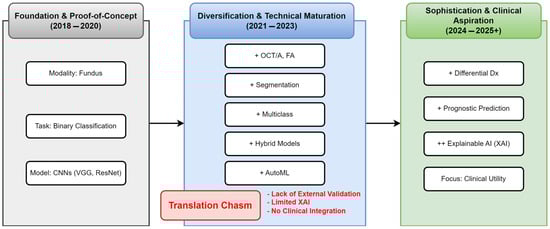 Ocular Toxoplasmosis (OT), a leading cause of infectious posterior uveitis, presents significant diagnostic challenges in atypical cases due to phenotypic overlap with other retinochoroiditides and a reliance on expert interpretation of multimodal imaging. This scoping review systematically maps the burgeoning application of artificial intelligence (AI), particularly deep learning, in automating OT diagnosis. We synthesized 22 studies to characterize the current evidence, data landscape, and clinical translation readiness. Findings reveal a field in its nascent yet rapidly accelerating phase, dominated by convolutional neural networks (CNNs) applied to fundus photography for binary classification tasks, often reporting high accuracy (87–99.2%). However, development is critically constrained by small, imbalanced, single-center datasets, a near-universal lack of external validation, and insufficient explainable AI (XAI), creating a significant gap between technical promise and clinical utility. While AI demonstrates strong potential to standardize diagnosis and reduce subjectivity, its path to integration is hampered by over-reliance on internal validation, the “black box” nature of models, and an absence of implementation strategies. Future progress hinges on collaborative multi-center data curation, mandatory external and prospective validation, the integration of XAI for transparency, and a focused shift towards developing AI tools that assist in the complex differential diagnosis of posterior uveitis, ultimately bridging the translational chasm to clinical practice.