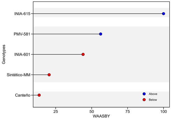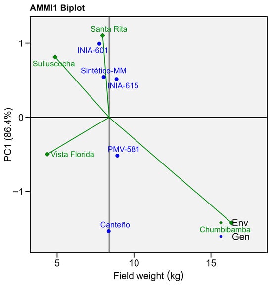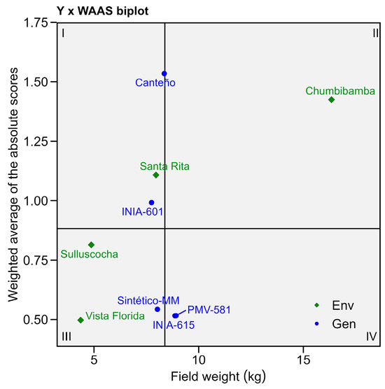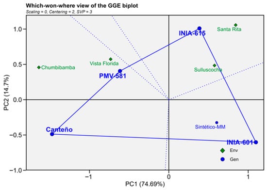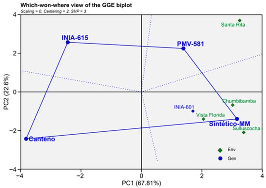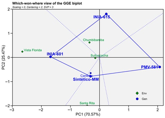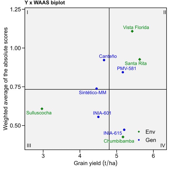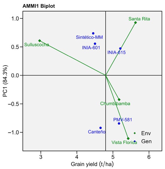 Purple corn (Zea mays L.) is a nutraceutical crop of increasing economic importance in Peru, yet its productivity is highly influenced by genotype × environment (G × E) interactions across heterogeneous agro-ecological zones. Therefore, selecting suitable genotypes for specific environments is essential to optimize variety deployment and maximize site-specific yield. Five purple-maize genotypes (INIA-601, INIA-615, Canteño, PMV-581, and Sintético-MM) were evaluated in four contrasting Peruvian sites using a randomized complete-block design. Grain yield, field weight, anthesis–silking interval (ASI), plant height, and ear-rot incidence were analyzed with combined analysis of variance (ANOVA), the additive main effects and multiplicative interaction (AMMI), genotype and genotype-by-environment (GGE) biplots, Weighted Average of Absolute Scores (WAAS), weighted average of absolute scores and best yield index (WAASBY), and Y × WAAS indices. Environment accounted for 90.1% of field-weight variation (p < 0.0001) and 50.2% of grain-yield variation (p < 0.001), while significant G × E interactions (3.93% and 18.14%, respectively) justified bilinear modeling. AMMI1 and GGE “which-won-where” biplots identified INIA-615 and PMV-581 as broadly adapted, with INIA-615 achieving the highest WAASBY and positioning in quadrant IV of Y × WAAS (high yield, high stability). INIA-601 and Sintético-MM exhibited exceptional stability (low ASV) but moderate productivity; Canteño showed limited adaptability. Chumbibamba emerged as a key discriminating, high-productivity location. From an agronomic perspective, INIA-615 is recommended for high-productivity valleys such as Sulluscocha and Santa Rita, where its yield potential and stability are maximized. These findings underscore the potential of integrating multivariate stability metrics with physiological and disease-resistance traits to guide the selection of superior purple corn cultivars. Overall, INIA-615 represents a robust candidate for enhancing yield stability, supporting sustainable intensification, and expanding the nutraceutical value chain of purple corn in the Andean highlands.