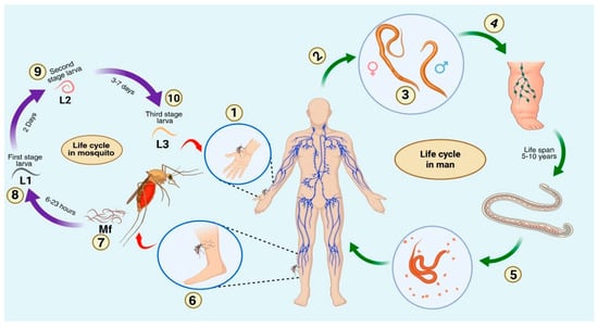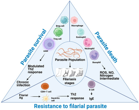 Filarial parasites are long-lived organisms that cause extreme morbidity due to pathological manifestations, including lymphedema, hydrocele, and elephantiasis. Understanding the hosts’ immune responses to filarial parasites is crucial to developing new and effective anti-filarial treatments. The review thoroughly examines and summarises immunological modulation,