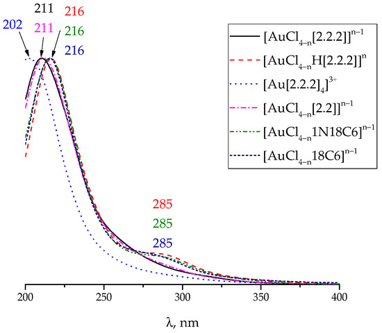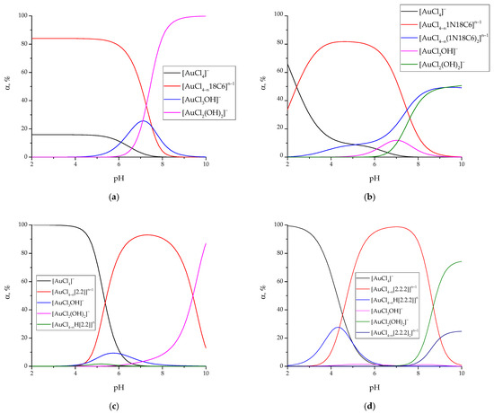 The growing demand for gold in various high-technology applications necessitates the development of efficient and selective methods for its recovery and analysis, which can be achieved using such macrocyclic ligands as crown esters and their aza-substituted derivatives. The present paper reports on the equilibrium constants for the formation of gold(III) complexes with 18-crown-6, 1-aza-18-crown-6, 1,10-diaza-18-crown-6, and the cryptand 4,7,13,16,21,24-hexaoxa-1,10-diazabicyclo[8.8.8]hexacosane (Kryptofix 222) in aqueous solution at T = 298.2 K, p = 0.1 MPa, I → 0. The equilibrium constants (log β) for the substitution of chloride ions by macrocycles were determined to be 4.52 ± 0.04, 9.15 ± 0.03, 9.08 ± 0.07, and 11.51 ± 0.08, respectively. Equilibrium constants for protonated and polyligand species are also provided. The complexation mechanism was elucidated using a combination of spectroscopic techniques. UV-Vis and IR spectroscopy confirm the substitution of chloride ligands by the nitrogen donor atoms of the aza-macrocycles within the tetrachloroaurate(III) ion. Furthermore, 1H NMR analysis reveals that the diaza-substituted ligands can form both inclusion complexes, where the gold cation is encapsulated within the macrocyclic cavity, and exclusion complexes. These findings provide a quantitative foundation for the design of novel macrocycle-based extractants and sensors for gold(III).