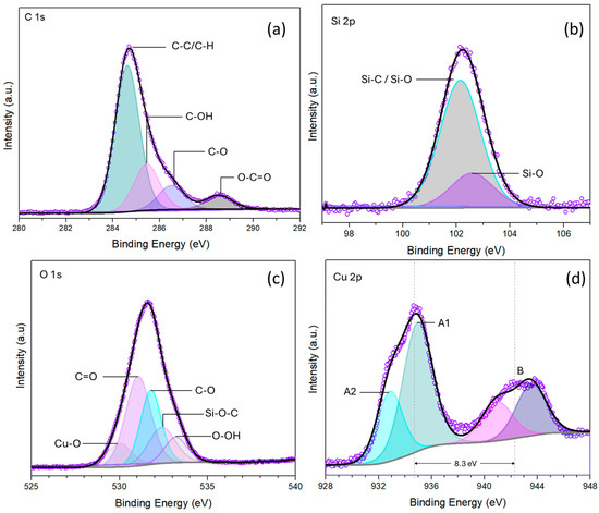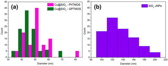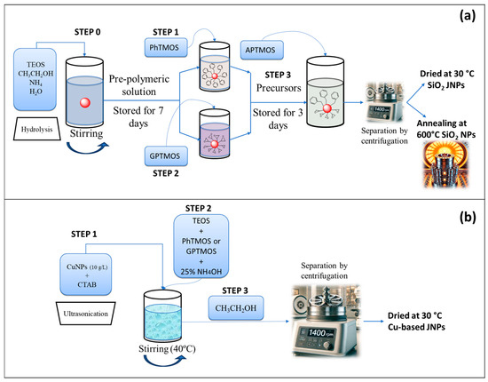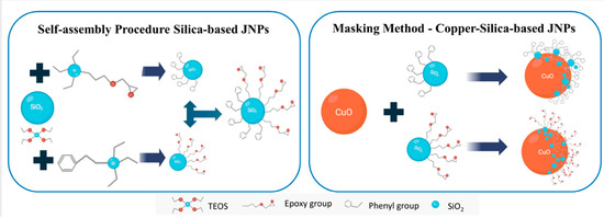 Janus nanoparticles (JNPs) synthesis has caught the scientific community’s attention due to their amphiphilic properties and extensive areas of application. In this work, different new copper–silica-based and silica-based JNPs were synthesized using a novel masking methodology and a self-assembly method based on sol–gel