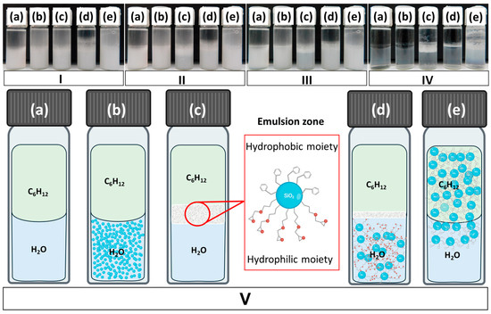 Janus nanoparticles (JNPs) synthesis has caught the scientific community’s attention due to their amphiphilic properties and extensive areas of application. In this work, different new copper–silica-based and silica-based JNPs were synthesized using a novel masking methodology and a self-assembly method based on sol–gel procedures, respectively. Moreover, various techniques were used to characterize the developed nanomaterials, including scanning electron microscopy (SEM), X-ray diffraction (XRD), Fourier Transform Infrared Spectroscopy (FTIR), and X-ray photoelectron spectroscopy (XPS). Two types of copper–silica-based Janus nanoparticles were synthesized with a 40 to 70 nm size, while SiO2-based JNPs of around 135 nm were obtained. The duality of different JNPs was confirmed by SEM and by a simple and economical route based on an emulsion stabilization path: analyzing dispersion/aggregation and associated behavior at the immiscible solvent interface. JNPs exhibited an extended residence time over 20 days at an immiscible solvent interface, thereby enhancing the resulting emulsion interface stability. This behavior highlighted their amphiphilic characteristics in comparison to conventional nanoparticles. Consequently, a procedure to determine nanoparticle amphiphilicity could be further standardized.