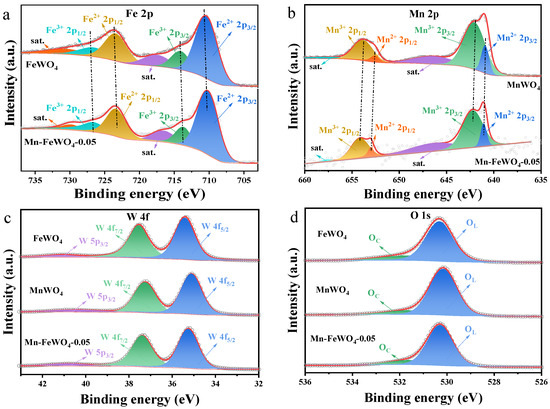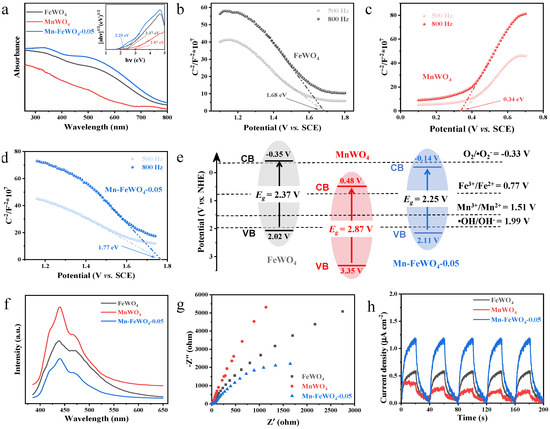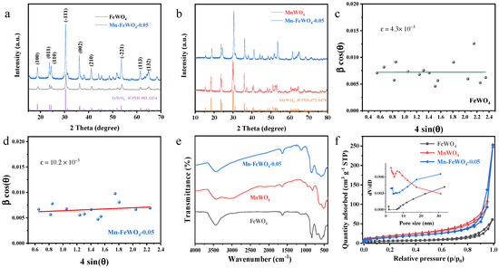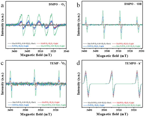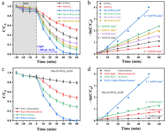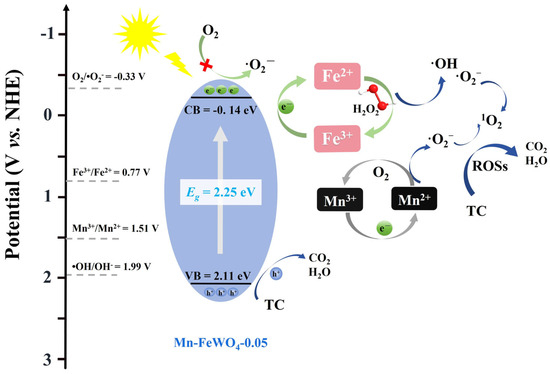 Photo-Fenton technology is considered an effective method for removing organic pollutants from water. In this work, a novel Mn-doped FeWO4 (Mn-FeWO4) photocatalyst was synthesized via a one-step hydrothermal method and applied for the photo-Fenton degradation of tetracycline (TC). The optimal Mn-FeWO4-0.05 achieved 100% removal of TC within 60 min under visible light irradiation with a degradation rate constant of 0.0793 min−1, which is 4.5 times higher than that of pristine FeWO4. Systematic characterization revealed that Mn2+ ions were successfully incorporated into the FeWO4 lattice, inducing lattice expansion and narrowing the bandgap from 2.37 eV to 2.25 eV, while also adjusting the conduction and valence band positions. This modulation significantly enhanced visible light absorption and promoted the separation and migration of photogenerated electron–hole pairs. In addition, the Mn2+/Mn3+ and Fe2+/Fe3+ dual redox cycles ensure the continuous generation of reactive oxygen species. Radical trapping experiments and electron paramagnetic resonance (EPR) spectroscopy demonstrated that superoxide radicals (•O2−) and photogenerated holes (h+) were the dominant reactive species, while singlet oxygen (1O2) and hydroxyl radicals (•OH) played auxiliary roles. Moreover, Mn-FeWO4-0.05 exhibited excellent stability, strong anti-interference ability against common anions, and high degradation efficiency toward various pollutants.