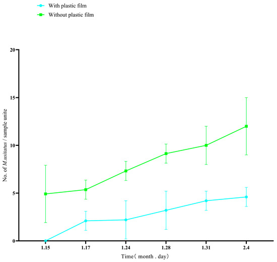 Megalurothrips usitatus (Bagnall) (Thysanoptera: Thripidae) is a serious insect pest, causing severe damage to crops in Southeast Asia and Hainan Province, China. The misuse of chemical pesticides has led to high resistance in pests to many pesticides. Physical control is an alternative method that is environmentally friendly. We investigated the effects of silver-gray plastic film on the behavior of M. usitatus on cowpea (Vigna ungiculata). The observations of behavior found that the silver-gray plastic film has different repellent effects on female and male thrips, with a repellency rate of over 90% for male thrips, while it repels female thrips at a rate of 85% in the laboratory. Field surveys have found that the number of M. usitatus arrived at the first peak at 7:00–9:00 a.m., and then gradually decreased, reaching its lowest point by noon, and then gradually increased to reach the second peak at 13:00–15:00 p.m. on a sunny day. In the climbing period of yardlong beans, before flowering, despite the increasing numbers of thrips, we found that the number of thrips in the silver-gray plastic film hanging area was significantly lower than that in the control area. During the early and late stages of flowering, the number of thrips in the silver-gray plastic film hanging area was significantly lower than that in the control area, but during the peak flowering period, there was no significant difference in thrips numbers between the areas with silver-gray plastic film and the control areas. These results indicate that the silver-gray plastic film is a potential method to decrease damage from M. usitatus, especially in the early stages of crop growth.