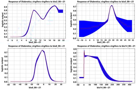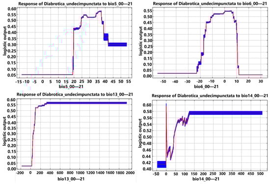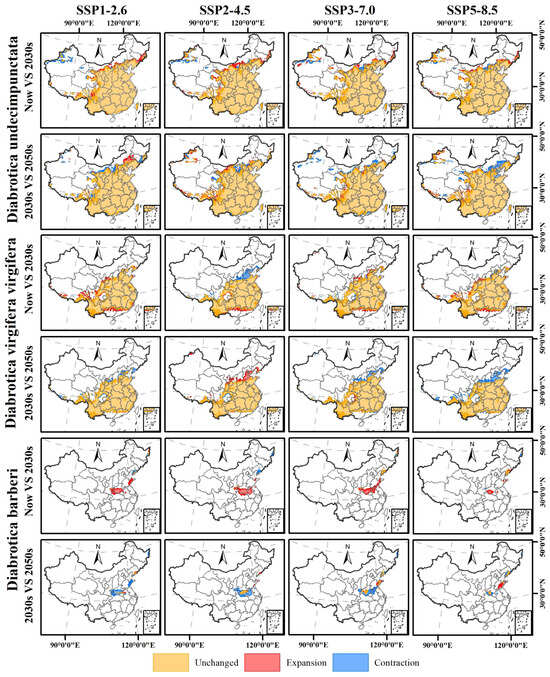 Corn rootworms of Diabrotica virgifera virgifera Le Conte, 1868; Diabrotica undecimpunctata howardi Barber, 1947, and Diabrotica barberi R.F. Smith & Lawrence, 1967 are important pests of corn crops that natively occur in America and have a potential risk of spreading into China through natural spreading or anthropogenic invasion. In this study, the potential geographic distribution and suitable area of these three Diabrotica species based on their global distribution samples and relevant bioclimatic variables were estimated, and an overlay analysis was further carried out in combination with the actual distribution of corn-growing regions, especially in China, in order to assess the potential invasion risks of these Diabrotica beetles, especially in the corn-planting regions of China. The results indicated that six bioclimatic variables (i.e., bio2 (mean diurnal range), bio4 (temperature seasonality), bio5 (max temperature of the warmest month), bio6 (min temperature of coldest month), bio13 (precipitation of wettest month), and bio14 (precipitation of driest month)) were selected for the analysis of the potential geographic distribution and suitable areas of these Diabrotica beetles. The suitable area ranges of D. undecimpunctata and D. virgifera virgifera are relatively large in China, i.e., 21.01–48.46° N and 74.01–131.26° E for D. undecimpunctata and 21.58–41.42° N and 78.71–124.43° E for D. virgifera virgifera, respectively, while D. barberi occupies only a small area in China, i.e., 34.21–46.81° N and 108.80–133.75° E. Based on the overlay analysis of the potential geographic distribution of these three Diabrotica species and the actual distribution of corn-growing regions in China, D. undecimpunctata and D. virgifera virgifera have the largest potential geographic distribution areas, totaling 2.618 × 107 ha and 1.814 × 107 ha in 22 and 20 provinces respectively, while D. barberi has the lowest potential geographic distribution area just in 8 provinces, totaling 44.37 × 104 ha, indicating a low-suitability area. Moreover, under the four climate scenarios (i.e., SSP1_2.6, SSP2_4.5, SSP3_7.0, and SSP5_8.5) in the 2030s and 2050s, these Diabrotica beetles have the potential for sporadic increases or decreases surrounding the potential suitable areas under the current scenario. However, it is worth noting that the high-suitability areas of D. undecimpunctata and D. virgifera virgifera decreased, and their medium- and low-suitability areas increased accordingly. It is presumed that Diabrotica beetles, especially D. virgifera virgifera and D. undecimpunctata, have a high risk of potential invasion into China because there is a large potentially suitable area distribution for their possible occurrence in the maize-planting regions of China.