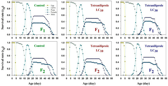 The South American tomato pinworm, Tuta absoluta (Meyrick), is among the most destructive invasive pests of tomato globally. The diamide insecticide tetraniliprole is increasingly used for its management. This study examines the sublethal effects of tetraniliprole on T. absoluta larvae, with a focus on its transgenerational impacts. Bioassays demonstrated that tetraniliprole was highly toxic to third-instar T. absoluta larvae, with an LC50 of 0.029 mg/L. Sublethal (LC10) and low lethal concentrations (LC30) were used to investigate their impact on developmental, reproductive, and population parameters across two subsequent generations (F1 and F2). In the parental (F0) generation, exposure to tetraniliprole at both concentrations significantly prolonged larval and pupal durations and reduced adult longevity and fecundity. In both F1 and F2 generations, concentration-dependent effects were observed—LC10 accelerated development and enhanced fecundity and population growth, indicative of a hormetic response, whereas LC30 delayed development and suppressed reproduction and survival. Life table analyses revealed significant changes in the r, λ, and T, particularly under LC30. Additionally, the RT-qPCR analysis revealed the downregulation of development and reproduction-related genes (Vg, VgR, and JHBP) in the F0 generation following exposure to tetraniliprole (LC10 and LC30). In contrast, these genes were upregulated in the progeny generations (F1 and F2) at LC10. Furthermore, the overexpression of key detoxification genes, particularly CYP4M116 and CYP6AW1, persisted across all three generations. Taken together, these findings reveal a substantial risk of unintended population resurgence (hormesis effects) at sublethal concentrations, underscoring the importance of integrating transgenerational consequences into insecticide resistance management programs for sustainable control of this key insect pest.