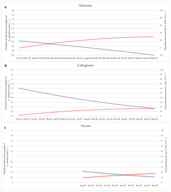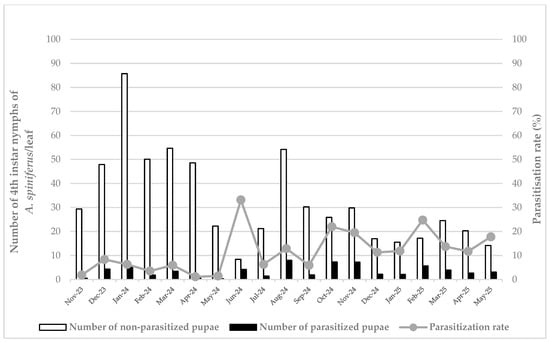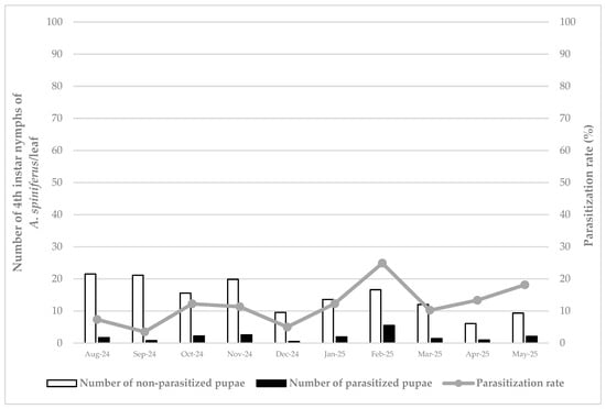 Since its first report in 2020, Aleurocanthus spiniferus has rapidly spread in Sicily, causing alarm among citrus growers. To assess biocontrol possibilities, its spontaneous natural enemies were observed and, from summer 2023, sporadic parasitization was noted by an unknown species of the genus Eretmocerus, recently described as E. iulii. Parasitization over the OSW was studied regularly from November 2023 at two sites and from August 2024 at a third site (all of them in eastern Sicily). At the first two sites, parasitization was very low (<1%) at the beginning of the observations, increased during autumn 2023 (not exceeding 10%), decreased during winter 2023–2024 and rapidly increased again during spring 2024, peaking in May–June with over 30%. After declining during the hot and dry summer 2024, parasitization increased again in autumn 2024, reaching 15–20% higher values compared to the previous autumn, and continued to rise gradually until the end of the monitoring period. A similar parasitization trend was noted at the third site. At all three sites, increasing parasitization coincides with a lower density of OSW nymphs. These findings show the potential of E. iulii as a promising biological control agent, offering a sustainable solution to mitigate the effect of this whitefly on citrus production in Sicily.