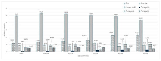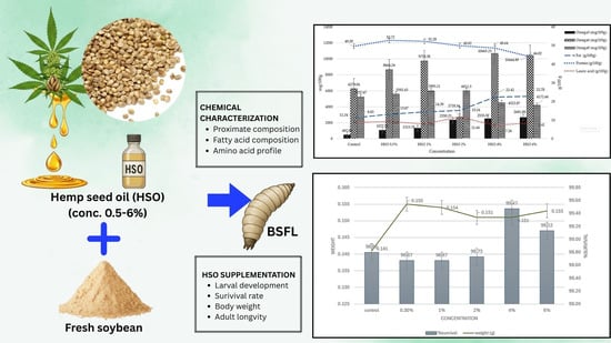 The black soldier fly (BSF), Hermetia illucens, has gained increasing attention as a sustainable protein source for animal feed. This study investigated the effects of dietary supplementation with hemp seed oil (HSO) at 0.5–6% concentrations on the growth performance and nutritional composition of