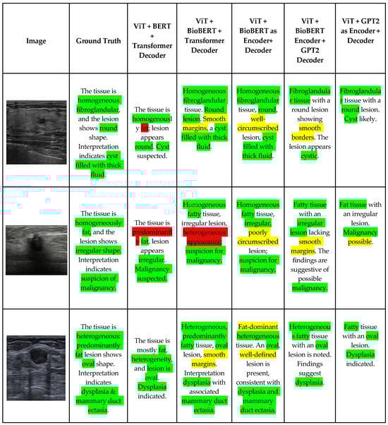 Breast ultrasound imaging is widely used for the detection and characterization of breast abnormalities; however, generating detailed and consistent radiological reports remains a labor-intensive and subjective process. Recent advances in deep learning have demonstrated the potential of automated report generation systems to support clinical workflows, yet most existing approaches focus on chest X-ray imaging and rely on convolutional–recurrent architectures with limited capacity to model long-range dependencies and complex clinical semantics. In this work, we propose a multimodal Transformer-based framework for automatic breast ultrasound report generation that integrates visual and textual information through cross-attention mechanisms. The proposed architecture employs a Vision Transformer (ViT) to extract rich spatial and morphological features from ultrasound images. For textual embedding, pretrained language models (BERT, BioBERT, and GPT-2) are implemented in various encoder–decoder configurations to leverage both general linguistic knowledge and domain-specific biomedical semantics. A multimodal Transformer decoder is implemented to autoregressively generate diagnostic reports by jointly attending to visual features and contextualized textual embeddings. We conducted an extensive quantitative evaluation using standard report generation metrics, including BLEU, ROUGE-L, METEOR, and CIDEr, to assess lexical accuracy, semantic alignment, and clinical relevance. Experimental results demonstrate that BioBERT-based models consistently outperform general domain counterparts in clinical specificity, while GPT-2-based decoders improve linguistic fluency.