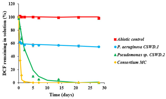 Diclofenac (DCF) is a widely used non-steroidal anti-inflammatory drug whose presence in environmental matrices has led to its classification as an emerging contaminant. Developing effective and sustainable removal strategies is therefore essential. In this study, Pseudomonas aeruginosa CSWD.1, Pseudomonas sp. CSWD.2, and a