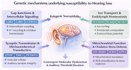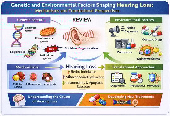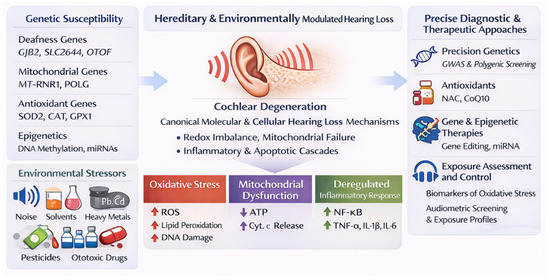 The central mechanistic hypothesis underlying multifactorial hearing loss posits that genetic susceptibility and environmental exposures act synergistically to disrupt cochlear homeostasis through redox imbalance, mitochondrial dysfunction, and pro-inflammatory mechanisms. This gene–environment paradigm has significant translational implications: elucidating the molecular crosstalk between genetic variants