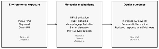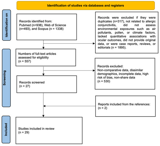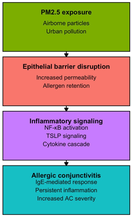 Environmental exposures are increasingly recognized as important drivers of ocular surface inflammation, yet their combined contribution to the onset, exacerbation, and clinical burden of allergic conjunctivitis (AC) has not been comprehensively synthesized. This systematic review evaluated the evidence linking air pollutants, aeroallergens, and