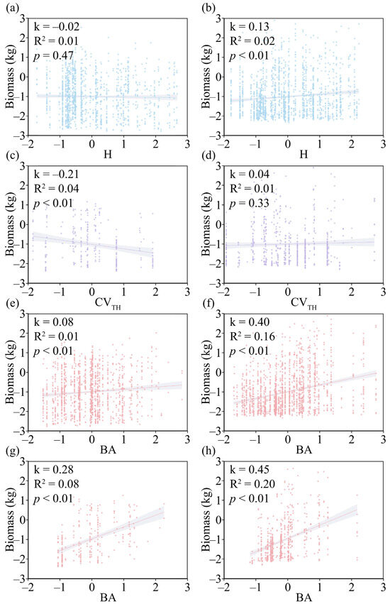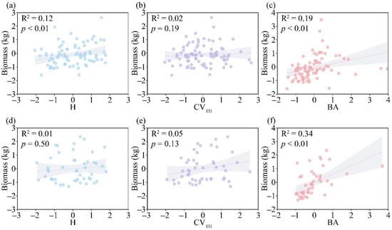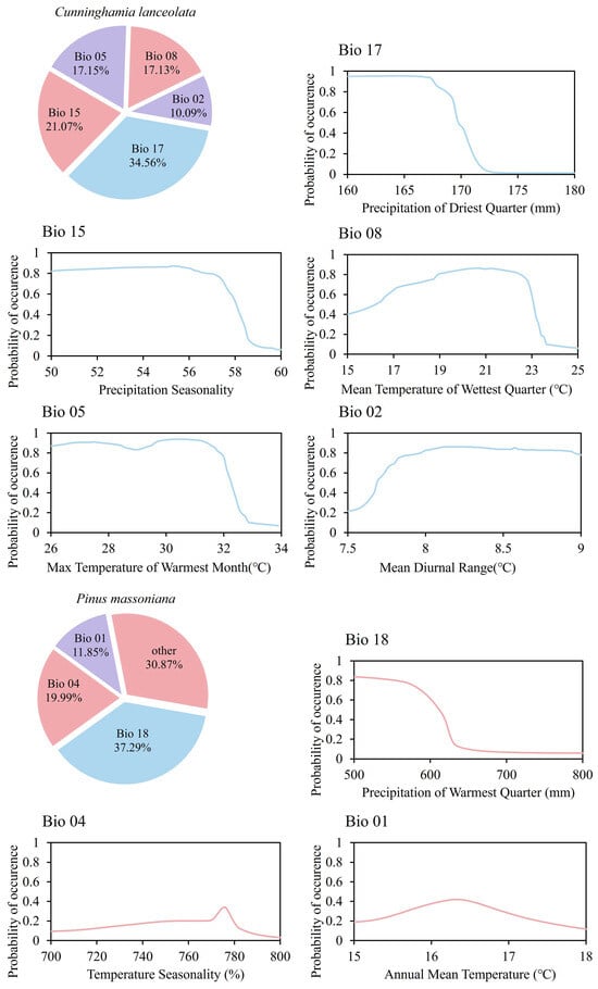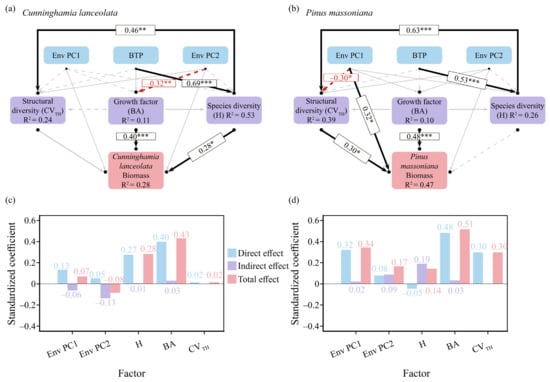 Greenhouse gases emitted by humans have exacerbated global climate change. Forests can effectively sequester atmospheric carbon dioxide through photosynthesis, and afforestation has been widely adopted worldwide to mitigate climate change. Cunninghamia lanceolata and Pinus massoniana, as major afforestation tree species, are extensively cultivated in southern China. However, the mechanisms by which climate, topography, biodiversity, forest structure, and forest growth status affect the productivity of these two species remain unclear. This study used forest inventory data from Lishui City combining the Biomod2 model with a structural equation model (SEM) to investigate the differential effects of biotic and abiotic factors on the productivity of the two tree species. The results showed that at the same diameter at breast height (DBH), the biomass of P. massoniana reached 384.67 kg, accounting for 188.75% of that of C. lanceolata (211.07 kg). The dominant climatic factors affecting C. lanceolata and P. massoniana were different; the most important climatic factors affecting C. lanceolata were Bio 17, Bio 15, Bio 05, Bio 08, and Bio 02, while those affecting P. massoniana were Bio 18, Bio 04, and Bio 01. Furthermore, the explanatory power of the structural equation model (SEM) optimized by the Biomod2 model was effectively improved. Biodiversity and forest growth factors were the most important biotic factors affecting C. lanceolata (p < 0.01), while structural diversity and forest growth factors were the most important biotic factors affecting P. massoniana (p < 0.05). Biodiversity and structural diversity exerted divergent effects on C. lanceolata and P. massoniana in different growth stages, exerting negative effects in the early growth stage and positive effects in the late growth stage. These outcomes were jointly driven by the selection effect and niche complementarity. This study recommends the forest management practices should select tree species based on local conditions.