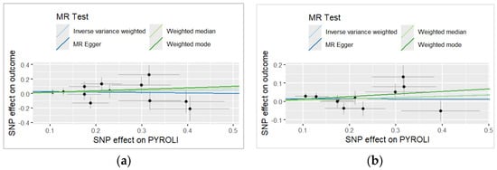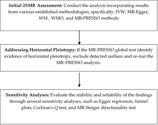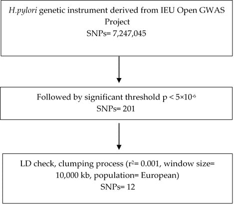 Background/Objectives: Pancreatic cancer is one of the most lethal malignancies, with poor survival and few established modifiable risk factors. While Helicobacter pylori (H. pylori) infection is a known cause of gastric cancer, its role in pancreatic cancer remains unclear, with inconsistent observational evidence. Methods: We applied two-sample Mendelian randomisation (2SMR) to assess the causal effect of H. pylori infection on pancreatic cancer risk. Genetic instruments were derived from GWAS data on anti-H. pylori IgG levels in the ALSPAC cohort (n = 4638). Outcomes were pancreatic cancer cases from UK Biobank (936 cases, 400,294 controls) and a combined dataset including UK Biobank, FinnGen, and MVP (5979 cases, 1,234,860 controls). Inverse-variance weighted (IVW) MR was the primary method, supported by MR-Egger, weighted median/mode and MR-PRESSO, with sensitivity analyses for pleiotropy. Results: Twelve and eleven independent SNPs explained 7.5% and 6.9% of H. pylori variance (mean F-statistics 22.37 and 22.42). No significant causal association was observed. IVW ORs were 1.039 (95% CI: 0.846–1.440, p = 0.466) for UK Biobank and 1.077 (95% CI: 0.962–1.206, p = 0.197) for the combined dataset. All complementary methods yielded null results, with no strong evidence of pleiotropy. Conclusions: This 2SMR study found no evidence that H. pylori infection causally increases pancreatic cancer risk. Larger studies with refined exposure measures are warranted.