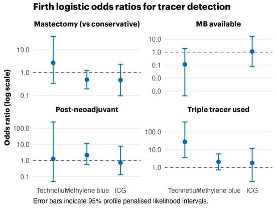 Background: Background: Sentinel lymph node (SLN) biopsy often combines technetium-99m (99mTc), indocyanine green (ICG), and methylene blue (MB), but few contemporary audits quantify the performance of each tracer when used together in routine practice. Methods: We conducted a single-center retrospective audit of 111 consecutive SLN procedures for breast cancer patients undergoing SLNB using a triple-tracer approach with technetium-99m (99mTc), indocyanine green (ICG), and methylene blue (MB). We evaluated sentinel lymph node detection rates, the number of nodes retrieved, tracer concordance, and subgroup performance (including those with mastectomy and post-neoadjuvant therapy). Results: Identification was 96.4% for 99mTc (107/111), 93.7% for ICG (104/111), and 78.4% for MB (87/111). Performance was heterogeneous (Q = 26.2, p < 0.001); 99mTc and ICG each outperformed MB (Holm-adjusted p < 0.001), while 99mTc and ICG did not differ significantly. Triple-tracer workflows were associated with higher odds of detection; cross-validated AUCs reached 0.98 for 99mTc and 0.82 for ICG. Conclusions: Technetium remains a foundational tracer for SLNB, with ICG serving as a valuable adjunct that enhances nodal visualization and overall detection efficacy, and MB adds redundancy. Triple-tracer mapping achieved the best overall nodal identification and was associated with fewer sentinel nodes excised when complete tracer concordance was observed.