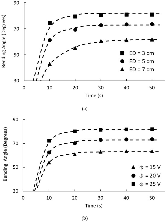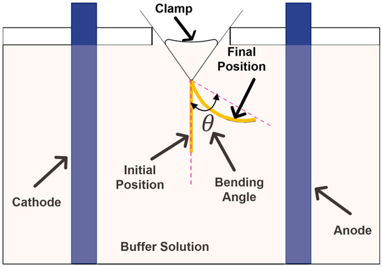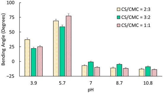 Biocompatible electroactive hydrogels with bidirectional pH-responsive bending are important for the creation of biomedical actuators. This study developed chitosan/carboxymethylcellulose (CS/CMC) semi-interpenetrating networks (SIPNs) with different volume ratios, which were crosslinked with glutaraldehyde. The swelling and bending behaviors of SPINs were systematically characterized as a function of the pH of the solution and the magnitude of the applied electric field. The hydrogels exhibited pH-dependent bidirectional actuation, with the maximum swelling of 4.67–6.00 at pH ≈ 3.9 and minimum swelling of 1.58–2.53 at pH ≈ 5.7. The SPINs with CS/CMC = 1:1 composition achieved the highest bending angle of 77° at pH ≈ 5.7, while cathodic bending up to an angle of −13.7° was observed in basic conditions. The electromechanical response was significantly enhanced by decreasing the electrode distance and increasing the applied voltage. The observed correlation between the composition, swelling behavior, and bending performance was explained in terms of the electrostatic interactions between NH3+ and COO− groups present in the CS/CMC mixtures. These findings provided novel insight into the ongoing efforts for the development of non-toxic electroactive hydrogels with tailored electromechanical bending behavior necessary for use as artificial muscles and biomedical actuators.