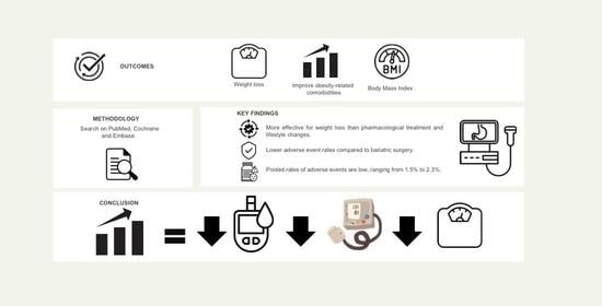 Background and Objectives: Endoscopic sleeve gastroplasty (ESG) is a minimally invasive endoscopic procedure that has demonstrated both safety and effectiveness in the treatment of obesity. By reducing the stomach’s volume without the need for surgical incisions, ESG promotes weight loss and can improve obesity-related comorbidities. However, patient responses to ESG can vary significantly. Materials and Methods: A comprehensive search was performed on PubMed, Embase, and Cochrane for studies with endoscopic sleeve gastroplasty; the main outcomes of interest are BMI, weight loss, and postinterventional complications. The search strategy employed a combination of keywords and Medical Subject Heading (MeSH) terms, including “endoscopic sleeve gastroplasty,” “endoscopy,” and “overweight”. To ensure the thoroughness of the review, additional manual searches of key journals and the reference lists of identified studies were performed. Grey literature, such as dissertations and conference abstracts, meta-analysis, and systematic reviews, was excluded to maintain a focus on peer-reviewed evidence. Duplicate records were identified and removed using Rayyan software to streamline the screening process. The I2 test was employed for heterogeneity assessment, while the risk of bias was evaluated utilizing ROBINS-I. Results: Our literature search resulted in the inclusion of 38 studies. Endoscopic sleeve gastroplasty for weight loss is important since it is more effective than pharmacological treatments and lifestyle changes and presents lower adverse event rates compared to bariatric surgery. Long-term weight loss outcomes varied, with total body weight loss ranging from 16% to 20.9% over a period from 2 to 5 years, while excess weight loss ranged from 13% to 79%. Revisional procedures showed higher failure rates, with up to 34.3% of patients experiencing insufficient weight loss. Most interventions led to clinically significant and sustained weight loss, though variability in outcomes highlights the need for further research to optimize long-term weight management strategies. Conclusions: Endoscopic sleeve gastroplasty (ESG) emerges as a promising minimally invasive option for weight loss, offering significant improvements in both weight reduction and obesity-related comorbidities, such as diabetes, hypertension, and dyslipidemia.