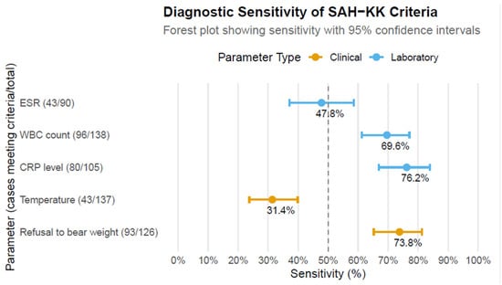 In children under 4, septic arthritis of the hip (SAH) caused by Kingella kingae (SAH-KK) can be misdiagnosed, as it does not meet classic septic joint criteria (fever > 38.5°, pain, limited range of motion, and inability to bear weight). The objective of this study was to report clinical and paraclinical characteristics in a large cohort of children with confirmed SAH-KK and to evaluate the reliability of the Kocher (KC) and Caird criteria (CC) in predicting SAH-KK. Medical records of 140 children with confirmed SAH-KK were collected. Data on sex, age, temperature on admission, weight-bearing status, white blood cell (WBC) count, platelet count, C-reactive protein (CRP) value, and erythrocyte sedimentation rate (ESR) were extracted. The study focused on the sensitivity of KC (body temperature, refusal to bear weight, leukocytosis, and ESR) and CC (KC criteria plus CRP level). All patients had bacteriologically confirmed SAH-KK; most had mild symptoms and near-normal inflammatory markers. CRP (76.2%) had the highest sensitivity, followed by weight-bearing status (73.8%) and WBC count (69.6%). Body temperature and ESR exceeded cutoff values in less than 50% of cases. Among 77 patients fulfilling all KC, 49 (63.5%) had less than a 40% probability of SAH. Of 50 children with complete CC, 20 (40%) had a 62.4% or lower probability of SAH. KC and CC are not sufficiently accurate to confidently exclude SAH-KK in preschool-aged children due to heterogeneous clinical presentations. Further studies are needed to redefine diagnostic criteria based on patient age and causative pathogens.