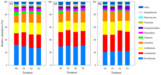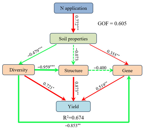Nitrogen (N) fertilization is known to influence soil microbial communities and crop yield, but how N affects the bacterial community and the link to crop yield across different soil types remains poorly understood. Here, we conducted three 5-year stationary field experiments to explore the effect of N fertilization (0, 180, 240, and 300 kg ha−1; termed N0, N1, N2, and N3, respectively) with different soil types (fluvo-aquic soil, FS; sandy soil, SS; lime concretion black soil, BS) on bacterial communities and the relationships among soil, microbes, and N-cycling functional genes to further investigate the effects on wheat yield. The results showed that the N2 treatment (240 kg ha−1) achieved the highest wheat yield, with significantly lower yields in SS than those in FS and BS. N fertilization significantly altered soil physicochemical properties, with a notable decrease in pH, particularly in SS, and an increase in NO3−-N content. Bacterial α-diversity significantly decreased with N application in SS but not in FS and BS, and NO3−-N played a primary role in shaping beta diversity in FS and BS. There were 43, 62, and 11 bacterial species that changed significantly from phylum to genus in the FS, SS, and BS, respectively. The abundance of nitrification genes increased with N fertilization in FS and SS, and N-cycling genes were significantly associated with soil properties. Partial Least Squares Path Modeling (PLS-PM) revealed that N fertilizer affected soil properties, which in turn regulated bacterial communities, and ultimately influenced wheat yield, explaining 67.4% of the yield variation. This study highlights the soil-specific responses to N application, providing a basis for optimizing N management and enhancing agricultural sustainability.