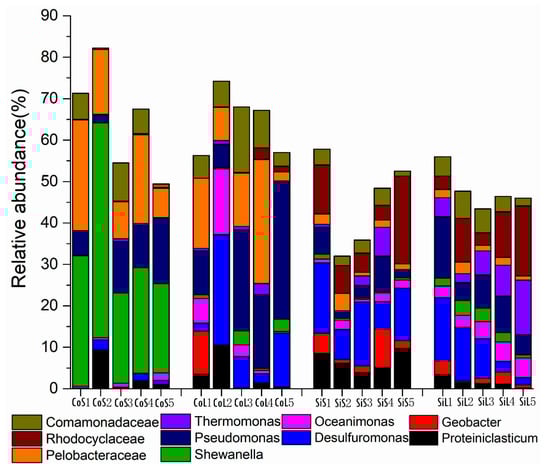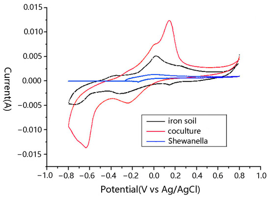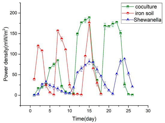 Microbial communities that develop within biofilms on electrodes are necessary for the proper functioning of the microbial electrochemical system. However, the mechanism through which an exogenous exoelectrogen influences the population dynamics and electrochemical performance of biofilms remains unclear. In this study, we explored the community structure dynamics and electrochemical characteristics of iron mine soil biofilm co-cultured with Shewanella oneidensis MR-1, with the anode as the electron acceptor, and compared the results with those of iron mine soil biofilms alone on the anode. Shewanella oneidensis MR-1 improved the electrochemical activity of microbial biofilms, resulting in a higher maximum power density of 195 ± 8 mW/m2 compared with that of iron mine soil (175 ± 7 mW/m2) and Shewanella (88 ± 8 mW/m2) biofilms individually. The co-cultured biofilms could perform near the highest power density for a longer duration than the iron mine soil biofilms could. High-throughput 16S rRNA gene sequencing of the biofilms on the anode indicated that the relative abundance of Pelobacteraceae in the co-culture system was significantly (p = 0.02) increased, while that of Rhodocyclaceae was significantly (p = 0.008) decreased, compared with that in iron mine soil biofilms. After continuing the experiment for two months, the presence of Shewanella oneidensis MR-1 changed the predominant bacteria of the microbial community in the biofilms, and the relative abundance of Shewanella was significantly (p = 0.02) decreased to a level similar to that in iron mine soil. These results demonstrate that Shewanella oneidensis MR-1 could improve the performance of iron mine soil biofilms in electrochemical systems by altering the composition of the functional microbial communities.