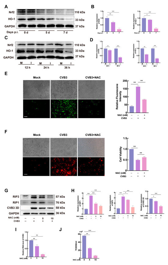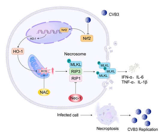 Coxsackievirus B3 (CVB3) is a primary causative agent of viral myocarditis (VMC), which can lead to both acute and chronic cardiac inflammation accompanied by progressive heart failure and arrhythmias. Although CVB3 has been implicated in various forms of programmed cell death, whether it triggers necroptosis and the underlying mechanisms remains unclear. This study aimed to investigate the role and mechanism of CVB3-induced necroptosis and its effect on viral replication. Using both in vitro and in vivo models, we demonstrated that CVB3 infection significantly upregulates the expression of key necroptotic markers RIP1 and RIP3 in HeLa cells and mouse myocardial tissues. This upregulation was accompanied by elevated intracellular reactive oxygen species (ROS) levels and suppression of the Nrf2/HO-1 antioxidant pathway. Intervention with the necroptosis inhibitor Necrostatin-1 (Nec-1) or the ROS scavenger N-acetylcysteine (NAC) markedly attenuated cell death, suppressed viral replication, and ameliorated myocardial injury and inflammatory responses in infected mice. Mechanistically, CVB3 inhibits the Nrf2/HO-1 pathway, thereby inducing substantial ROS accumulation that promotes necroptosis. This effect can be reversed by NAC treatment. Our study reveals a novel mechanism through which CVB3 induces ROS-dependent necroptosis via the suppression of the Nrf2/HO-1 pathway, providing new insights into the pathogenesis of viral myocarditis and suggesting potential therapeutic strategies.