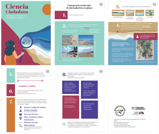Microplastic pollution is a global environmental problem that affects marine and coastal ecosystems, and whose traditional monitoring is often expensive and limited in coverage. In this citizen science project, through the active participation of 26 local volunteers, data were gathered on the abundance and types of microplastics present on various Mexican beaches, while also promoting public awareness. Participants received materials and basic training to identify and collect microplastics using a standardized methodology, which enabled the creation of a broad and representative database consisting of 63 samples from 42 different beaches. A total of 1500 particles were collected, of which 75.13% were microplastics. The average success rate in collecting microplastics among the volunteers was 63.7 ± 34.7%. The results revealed a considerable diversity of microplastics in the studied areas, with a mean concentration of 3.5 MP/m ± 3.4 MP/m, fragments as the most common type identified (45% of the total), white as the predominant color (43%) and polyethylene as the polymer with the highest proportion (31%). This citizen science approach proved to be an effective tool for environmental monitoring, as the median value of correct identification of microplastics in this study was 80%. This method facilitates large-scale data collection and contributes to community engagement in marine conservation. Moreover, although it needs improvement, the advantages of this methodology are evident in its ability to complement traditional scientific studies and support more informed and participatory public policies in plastic waste management.