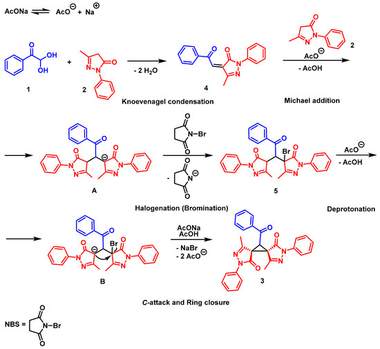 Cyclopropanes are important in drug discovery because their unique structure, including inherent three-dimensionality, can enhance a drug’s properties, such as metabolic stability, target binding, and membrane permeability. In this communication, (5R*,6R*) 11-benzoyl-4,10-dimethyl-2,8-diphenyl-2,3,8,9-tetraazadispiro[4.0.46.15]undeca-3,9-diene-1,7-dione was prepared via a stereoselective one-pot reaction of phenylglyoxal hydrate with two equivalents of 5-methyl-2-phenyl-2,4-dihydro-3H-pyrazol-3-one in EtOH in the presence of sodium acetate and N-bromosuccinimide. The structure of the newly synthesized compound was established by 1H and 13C NMR, IR spectroscopy, high-resolution mass spectrometry, and elemental analysis.