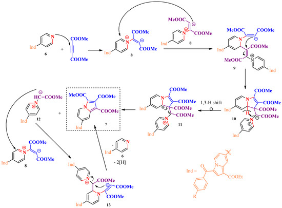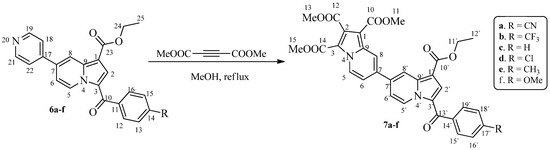 Six new unsymmetrical 7,7′-biindolizines were synthesized through an efficient metal-free [2+2+1] cycloaddition of ethyl 3-benzoyl-7-(pyridin-4-yl)indolizine-1-carboxylate with two equivalents of dimethyl acetylenedicarboxylate in methanol. The transformation involves one C≡C triple bond cleavage and provides access to previously unexplored unsymmetrical functionalized 7,7′-biindolizines.