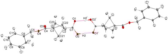 The compound 3-((benzyloxy)carbonyl)bicyclo[1.1.1]pentane-1-carboxylic acid was successfully synthesized. High-quality crystals were obtained, and its X-ray structure was solved and refined by Hirshfeld atom refinement using custom aspherical scattering factors with the Olex2/NoSphereA2 package. Hydrogen bonding interactions lead to head-to-head carboxylic acid dimer formation. A