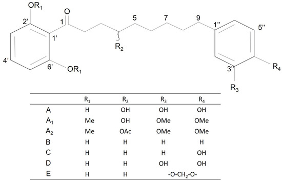 A phytochemical investigation of Myristica ceylanica resulted in the identification of seven arylalkanone-derived phenolic compounds, comprising one new naturally occurring arylalkanone (A), two derivatives (A1 and A2) prepared by chemical synthesis, and four known malabaricones (B–E). Density functional theory (DFT)
