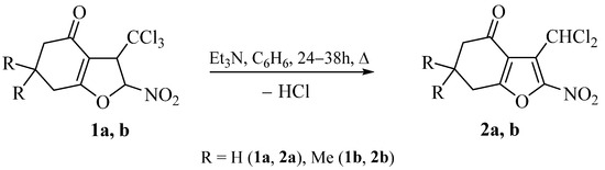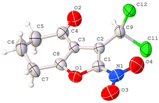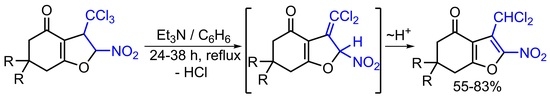 The previously unknown compounds—3-(dichloromethyl)-2-nitro-6,7-dihydro-1-benzofuran-4(5H)-ones—have been synthesized and structurally characterized via single-crystal X-ray diffraction, 1H, 13C–{1H}, 1H–13C HMQC and 1H–13C HMBC NMR spectroscopy, IR, and UV spectroscopy.