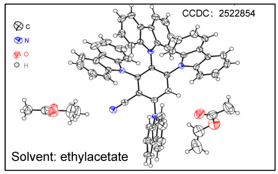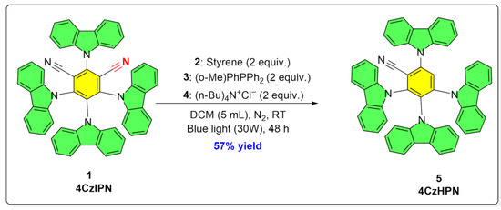 Here, we synthesized 2,3,4,6-tetra(9H-carbazol-9-yl)benzonitrile (4CzHPN) via visible-light-driven photocatalytic monodecyanation using the versatile metal-free catalyst 4CzIPN. Characterized by NMR, IR, X-ray diffraction, and DFT calculations, it features a 3.49 eV HOMO-LUMO gap and shows blue-shifted absorption/emission, emerging as a promising advanced metal-free
