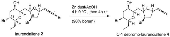 As a part of an SAR study aimed at testing the antitumor activity of some C15 acetogenins related to mycalin A, we report here the synthesis of the C-1 debromo-derivative of laurenciallene, a substance recently isolated from the red alga Laurencia obtusa. This new substance has been obtained by the selective, reductive debromination of the terminal bromoallene moiety of laurenciallene with Zn/AcOH. Its structure has been fully characterized by spectral methods, including 2D-NMR spectra.