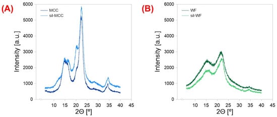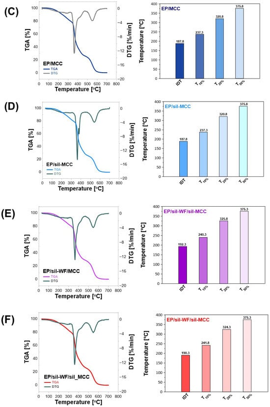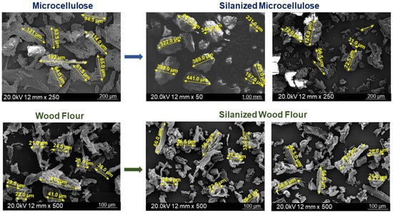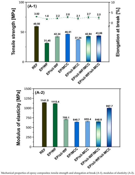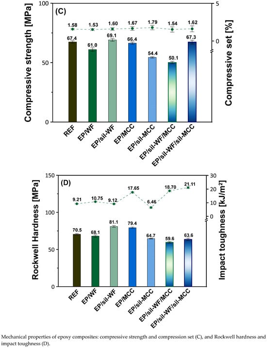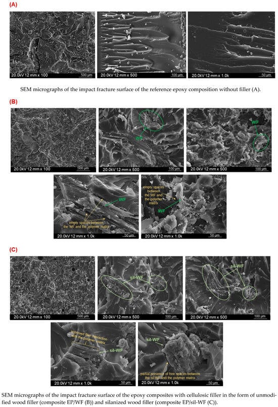 In response to growing interest in green additives derived from natural raw materials or post-production waste of natural origin, epoxy compositions containing the additive in the form of waste wood flour and microcellulose were prepared. The research involved the chemical modification of the additive through a two-stage silanization process using 3-aminopropyltriethoxysilane. Followed by filler’s characterization using Fourier Transformed Infrared Spectroscopy (FT-IR) to analyze the modification in chemical structure, Wide Angle X-Ray Diffraction (WAXD) to detect differences in crystal structure, and Scanning Electron Microscopy (SEM) to observe morphological changes. Next, waste oak flour (WF) and microcrystalline cellulose (MCC) were used in unmodified and silanized form (sil-WF and sil-MCC, respectively) to prepare epoxy composites, followed by testing their influence on the mechanical (hardness, tensile strength, flexural strength, compressive strength, and impact strength), thermal, and morphological characteristics of epoxy composites based on Epidian 6. Comparing the effect of modification on the properties of the analyzed additives, it was found that silanization had a larger impact on increasing the interaction of the waste wood flour with the epoxy matrix than silanization of MCC due to a lesser tendency of the sil-WF than the sil-MCC to agglomerate. An enhanced interaction of sil-WF with the polymer resulted in improved mechanical properties. Composite EP/sil-WF (cured epoxy composite based on low-molecular-weight epoxy resin Epidian 6 filled with 5 wt.% of silanized wood flour) was characterized by improved flexural (61.97 MPa) and compressive properties (69.1 MPa) compared to both EP/WF (cured epoxy composite based on low-molecular-weight epoxy resin Epidian 6 filled with 5 wt.% of unmodified wood flour) (42.39 MPa and 61.0 MPa) and the unfilled reference composition (54.55 MPa and 67.4 MPa, respectively). Moreover, compositions containing a cellulosic additive were characterized by better impact properties than the reference composition.