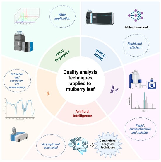 (1) Background: Diabetes mellitus is a chronic metabolic disease with a rising global prevalence. Mulberry leaf (ML), a traditional medicinal and edible plant, possesses notable hypoglycemic effects and has a long history of usage. This review aims to systematically consolidate the research progress on the hypoglycemic constituents derived from ML, including their chemical structure, extraction methods, quality analysis techniques, and hypoglycemic mechanisms. (2) Methods: Adhering to the Preferred Reporting Items for Systematic Reviews (PRISMA 2020) guidelines, a comprehensive literature search was conducted using Web of Science and PubMed databases to find relevant studies published between 2015 and 2025. (3) Results: This review evaluates both conventional and modern techniques such as water extraction, ultrasound-assisted extraction (UAE), microwave-assisted extraction (MAE), and enzyme-assisted extraction (EAE), highlighting their advantages and limitations when applied on ML. Additionally, this review examines the analytical techniques applied in the quality control of ML and its constituents. This is complemented by a summary of hypoglycemic mechanisms, focusing on the inhibition of oxidative stress, amelioration of insulin resistance, regulation of related enzyme activity, and modulation of gut microbiota. (4) Conclusions: ML demonstrates considerable potential for treating diabetes. However, further studies are needed for new drug discovery based on new ML-derived bioactive constituents, highly efficient extraction methods, quality analysis techniques, and underlying mechanisms.