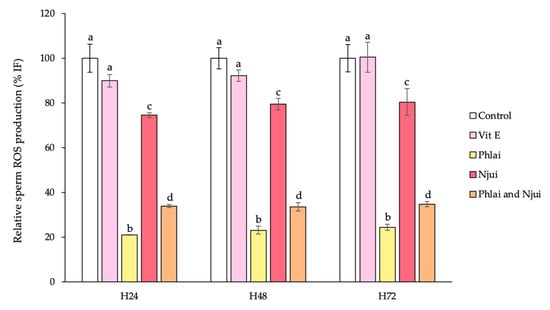 Infertility represents a significant global health issue, and the use of antioxidants in sperm preservation techniques provides an effective strategy to improve sperm quality. This study aims to examine the phytochemical components of Phlai and Njui extracts and their antioxidant effects on enhancing the motility of fresh bull semen. Among the extracts, Njui contained the highest levels of total phenolics, total tannins, and lycopene contents along with the strongest DPPH, ABTS, and AOPP inhibition. Phlai contained the highest levels of total flavonoids. Njui and combined extracts showed the strongest AGE inhibition. The motility of sperm in the semen extender supplemented with Phlai, Njui, and their combination exhibited greater total motility, particularly progressive motility, compared to sperm in the normal extender after 48–72 h. Furthermore, there was a reduced generation of ROS compared to sperm in the normal extender and with vitamin E acetate supplementation after 24–72 h. In conclusion, Phlai and Njui extracts, plentiful in bioactive chemicals, showed significant antioxidant activity and enhanced sperm motility by neutralizing free radicals and strengthening antioxidant defenses. The findings indicate that Phlai and Njui, especially in combination, provide advantages for sperm preservation.