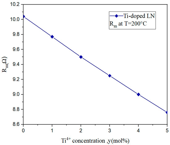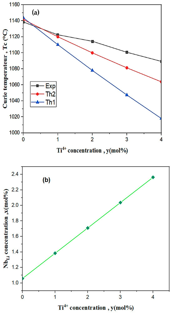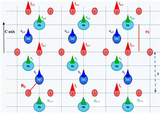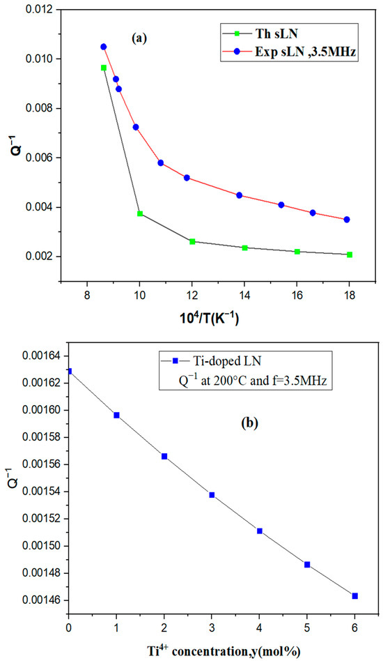 This study introduces a new theoretical framework for the ferroelectric phase transition in lithium niobate (LiNbO3), which explicitly incorporates electrostatic interactions between both first and second nearest-neighbor ions. This extended model is applied to estimate the inverse quality factor (Q−1), the equivalent mechanical resistance (Rm), and the Curie temperature (Tc) of pure and titanium-doped lithium niobate (LiNbO3:Ti). The proposed analytical expression for Tc is given by: . The analysis reveals that variations in Q−1 and Tc are governed by factors such as ionic mass, charge, and defect structure. The theoretical predictions show good agreement with experimental data reported in the literature—particularly for Q−1 in pure LiNbO3 and for Tc in Ti-doped LiNbO3—thus validating the reliability of the proposed model. Moreover, at constant temperature, both the inverse quality factor and the equivalent mechanical resistance decrease as the Ti concentration increases. This trend highlights that titanium doping enhances the acoustic performance of LiNbO3 substrates, making them more suitable for high-performance surface acoustic wave (SAW) device applications.