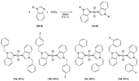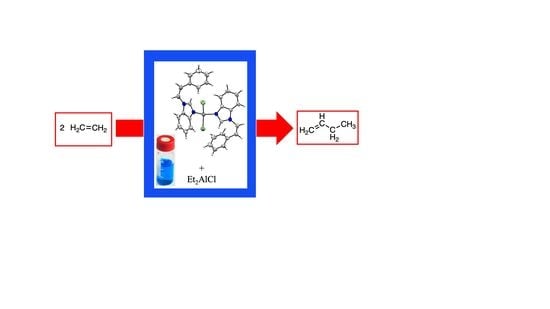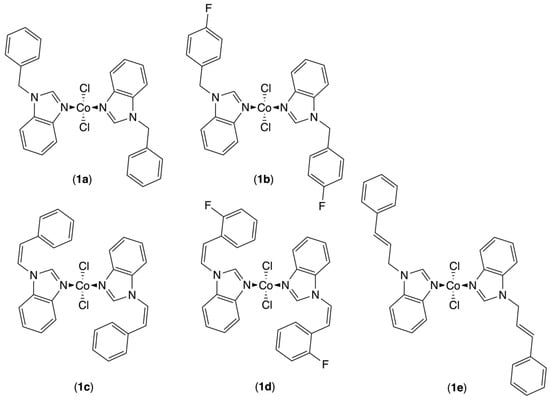 A series of five cobalt(II) complexes, dichloro-bis(1-benzyl-benzimidazole)-cobalt(II) (1a), dichloro-bis[1-(4-fluorobenzyl)-benzimidazole]-cobalt(II) (1b), dichloro-bis((Z)-1-styryl-benzimidazole)-cobalt(II) (1c), dichloro-bis[(Z)-1-(2-fluorostyryl)-benzimidazole]-cobalt(II) (1d) and dichloro-bis(1-cinnamyl-benzimidazole)-cobalt(II) (1e), were evaluated in ethylene dimerization. Four of these complexes were described for