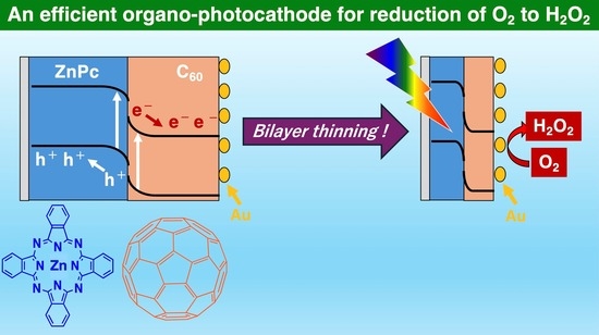 Hydrogen peroxide (H2O2) is a clean and environmentally friendly oxidant. At present, as an alternative to the conventional industrial procedure, namely, the anthraquinone method, a clean H2O2 production method is desired. The construction of an artificial photosynthetic system in which H2O2 can ideally be prepared from water and dioxygen (O2) is a promising approach. In such a system, an organic p-n bilayer comprising zinc phthalocyanine (ZnPc, p-type) and fullerene (C60, n-type) acts as a photocathode capable of O2 reduction to H2O2, where loading gold (Au) onto the C60 surface is necessary to achieve the corresponding reaction. However, the enhancement of the photocathodic activity of the organic p-n bilayer for H2O2 formation remains a critical issue. In this study, the effect of the thickness of an organo-bilayer (organo-photocathode) on photocathodic activity for H2O2 production was investigated. When both ZnPc and C60 were thin (approximately 10 nm each in thickness), the photocathodic activity of the ZnPc/C60 organo-photocathode was approximately 3.4 times greater than that of the thick ZnPc/C60 bilayer (i.e., ZnPc = ca. 70 nm and C60 = ca. 120 nm). The thin ZnPc/C60 bilayer exhibited a built-in potential at the p-n interface, where efficient charge separation occurs, resulting in a high concentration of electrons available for O2 reduction.