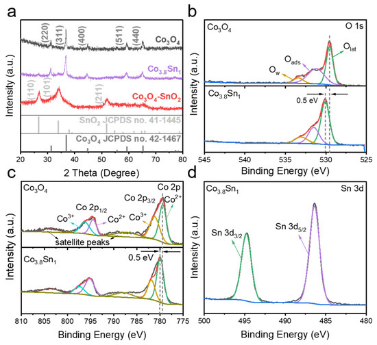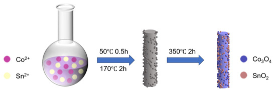 With the surging demand for high-performance energy storage devices, enhancing the energy density and charge-discharge efficiency of lithium-ion batteries has become an urgent need. Co3O4, with a high theoretical specific capacity of 890 mAh g−1, is regarded as a promising anode candidate. In this work, rod-like hybrid Co3O4/SnO2 composites were successfully prepared via the pyrolysis of cobalt-tin ethylene glycolate precursor. Notably, when the Co/Sn molar ratio is tuned to 3.8:1, the product evolves into nanorods. Lithium-ion batteries using Co3.8Sn1 as the anode deliver an initial specific capacity of 1588.9 mAh g−1, and retain a reversible capacity of 427.9 mAh g−1 after 500 cycles at 2 A g−1, demonstrating that Sn-doping-induced optimization of morphology and conductivity effectively enhances electrochemical performance.