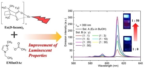 The optical and thermal behaviors of a chiral europium(III) β-diketonate complex, Eu(D-facam)3 (facam: 3-(trifluoromethylhydroxymethylene)-(+)-camphorate), were examined in the presence of imidazolium-based ionic liquid 1-ethyl-3-methylimidazolium acetate (EMImOAc). The addition of EMImOAc to Eu(D-facam)3 butanol solutions enhanced their luminescence
