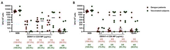 Background: Being central players in the adaptive immunity, the study of T-cell responses is crucial in both natural infections and vaccine-induced immunity. In this study, we assessed the antigen-specific T-cell responses to dengue virus (DENV) to identify the most immunogenic antigen for evaluating dengue-specific T-cell responses. Methods: Patients with dengue disease and subjects vaccinated with the QDENGA (TAK-003) vaccine (before and three months after vaccination) were enrolled. The T-cell-specific response was measured by ELISPOT and Activation Induced Markers (AIM) assay following PBMC stimulation either with DENV1-4 CD4 and CD8 MegaPools (MP) or serotype-specific DENV peptide pools at different concentrations. Results: We found that both DENV1-4 CD4 MP (at 1 µg/mL) and CD8 MP (at 5 µg/mL), which encompass all four DENV serotypes, elicited specific T-cell responses in patients with dengue infection independent of the infecting serotype. In contrast, selected serotype-specific DENV peptide pools have a lower ability to induce a measurable T-cell response. Moreover, DENV1-4 CD4 and CD8 MPs, at the highest concentrations, are suitable candidates to evaluate the dengue-specific T-cell response in vaccinated subjects. Conclusions: These findings support the use of the MP approach to investigate dengue-specific T-cell response to monitor the response during the infection and after vaccine administration.