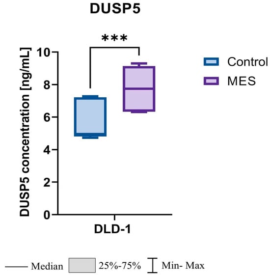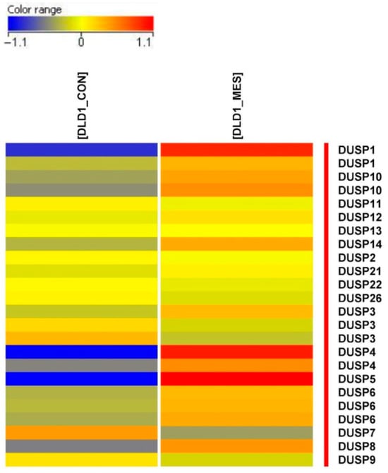 Colorectal cancer (CRC) remains one of the leading causes of cancer-related mortality worldwide, with its development closely linked to dysregulation of mitogen-activated protein kinase (MAPK) signaling pathways. Background: Dual-specificity phosphatases (DUSPs), as key regulators of MAPKs, play a crucial role in maintaining the balance between proliferation and apoptosis. Methods: In this study, we investigated the effect of mesalazine (MES) on the expression and activity of selected DUSP family members in normal colon epithelial cells (CCD-841CoN) and colorectal cancer cells (DLD-1). Results: Microarray analysis identified 24 transcripts with altered expression upon mesalazine treatment. The number of significantly regulated genes decreased with increasing fold-change (FC) thresholds, from 20 genes (FC > 1.1) to 13 (FC > 1.5) and 5 (FC > 2.0), all with p < 0.001. Among the DUSP genes, DUSP4 and DUSP5 showed the most pronounced and cell-type-dependent modulation. Mesalazine upregulated DUSP4 and DUSP5 expression in DLD-1 cells (p < 0.001), while reducing their expression in normal CCD-841CoN cells. ELISA confirmed a 1.56-fold increase in DUSP5 protein concentration in mesalazine-treated cancer cells compared with controls (p < 0.001). Conclusions: These findings suggest that mesalazine differentially modulates DUSP gene expression in normal and malignant colon epithelial cells, potentially contributing to its antiproliferative and pro-apoptotic effects through the regulation of MAPK signaling. These results provide new insights into the molecular mechanisms underlying the anticancer effects of mesalazine in colorectal cancer.