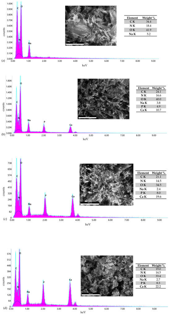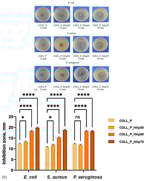 Background/Objectives: Bone defects remain widespread. Type I collagen–hydroxyapatite composites suit bone engineering by mimicking matrix structure, making them pertinent materials for bone tissue engineering across a range of defect types. Their application is well aligned with non-load-bearing conditions, while use in load-bearing sites requires mechanical properties that meet the demands of those environments. Marine collagen offers a low-cost source from processing by-products. This work aimed to develop perch collagen–hydroxyapatite scaffolds for bone tissue engineering. Methods: Composites with COLL:HAp ratios of 100:0, 50:50, 40:60, and 30:70 were prepared. After crosslinking and freeze-drying, porosity and water absorption were examined. SEM and X-EDS assessed morphology and elemental distribution. FT-IR confirmed the chemical composition. Compression tests evaluated mechanical behavior. Cell viability and colonization assessed the biological performance. Biodegradability, thermal stability, and antimicrobial activity were also determined. Results: FT-IR confirmed the characteristic absorption bands of both components. SEM and swelling behavior showed porous, interconnected structures with uniform hydroxyapatite dispersion. X-EDS indicated Ca/P ratios consistent with hydroxyapatite. Thermal analysis demonstrated scaffold stability. Compression tests showed mechanical resistance for all the scaffolds, with stiffness increasing with the inorganic content. Perch collagen enhanced biological functionality, supporting osteoblast viability and colonization. Biodegradation gradually proceeded. Antibacterial activity against the tested pathogens was detectable, though moderate. Conclusions: The developed scaffolds combined structural stability, controlled degradation, and favorable cell response, constituting a viable and promising candidate for applications in bone tissue engineering.