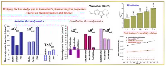 Background/Objectives: Advancing information on the key physicochemical properties of biologically active substances enables the development of formulations with reduced dosing, lower toxicity, and minimal adverse effects. This work addresses the knowledge gap concerning the pharmacologically relevant properties of harmaline (HML), with a focus on thermodynamic and kinetic aspects. New data were obtained on the compound’s solubility and distribution coefficients across a wide temperature range. Specifically, solubility was measured in aqueous buffers (pH 2.0 and 7.4), 1-octanol (OctOH), n-hexane (Hex), and isopropyl myristate (IPM), while distribution coefficients were determined in OctOH/pH 7.4, Hex/pH 7.4, and IPM/pH 7.4 systems. Methods: Three membranes—regenerated cellulose (RC), PermeaPad (PP) and polydimethylsiloxane-polycarbonate (PDS)—were used as barriers in permeability studies using a Franz diffusion cell. Results: At 310.15 K, the molar solubility of HML in the solvents decreased in the following order: OctOH > pH 2.0 > pH 7.4 > IPM > Hex. The distribution coefficient of HML showed a strong dependence on the nature of the organic phase, correlating with its solubility in the respective solvents. The OctOH/pH 7.4 distribution coefficient ranged from 0.973 at 293.15 K to 1.345 at 313.15 K, falling within the optimal range for potential drug bioavailability. The transfer of HML into OctOH (from either pH 7.4 or hexane) is thermodynamically spontaneous, whereas its transfer into Hex is unfavorable. Conclusions: Based on its permeability across the PP barrier, HML was classified as highly permeable. The distribution and permeation profiles of HML showed similar trends over 5 h in both the OctOH/pH 7.4–PP and IPM/pH 7.4–PDS systems. These systems were therefore proposed as suitable models for studying HML transport in vitro.