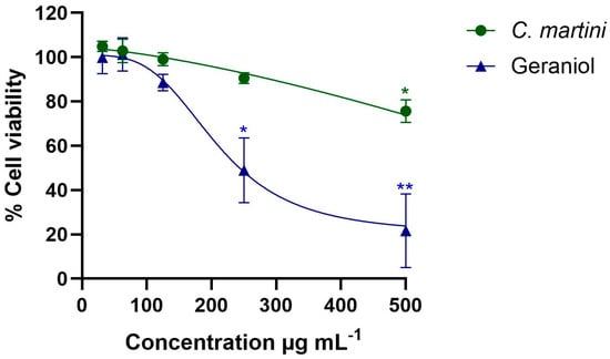Background/Objectives: Essential oils are liquid natural volatile mixture of compounds with several bioactive properties, which make them useful in a wide range of pharmaceutical applications. The aim of this work is to explore the antimicrobial impact of Cymbopogon martini essential oil against human clinical bacterial isolates from the skin and respiratory tract while also assessing its impact on mammalian cells. Geraniol, its main component according to GC-MS analysis, was evaluated under the same conditions. Methods: The composition of the essential oil was provided by the supplier. To elucidate the antimicrobial activity, the minimum inhibitory concentration (MIC) and the minimum bactericidal concentration (MBC) were determined. The impact on mammalian hepatic cells was determined using the 3-(4,5-dimethylthiazol-2-yl)-2,5-diphenyltetrazolium bromide (MTT) assay. Results: The essential oil showed activity against Gram-positive bacteria from the Streptococcus and Staphylococcus genera, with MIC values ranging from 125 to 250 µg mL−1 for Streptococcus agalactiae, Streptococcus anginosus, Streptococcus disgalactiae, and Streptococcus pyogenes. It also displayed activity against some of the tested Gram-negative bacteria, namely, Escherichia coli (MIC 350 µg mL−1), Moraxella catarrhalis (MIC 250 µg mL−1), and Morganella morganii (MIC 350 µg mL−1). In most cases, the essential oil showed lower MIC values than geraniol. Additionally, palmarosa oil had a weaker impact than geraniol in HepG2 cells. Conclusions: Both the essential oil and the pure compound exhibited activity against clinical isolates obtained from skin and respiratory tract samples.