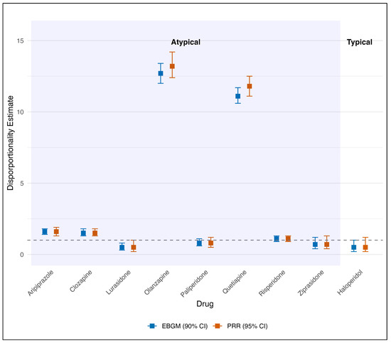 Objectives: To evaluate reports of diabetic ketoacidosis (DKA) associated with antipsychotic drug (APD) use submitted to the U.S. Food and Drug Administration’s Adverse Event Reporting System (FAERS). Methods: A retrospective pharmacovigilance analysis was conducted using FAERS data from January 2000 to December 2022. DKA cases were identified using the MedDRA preferred term “diabetic ketoacidosis” in reports listing antipsychotic drugs as suspect medications. Disproportionality analyses, including the proportional reporting ratio (PRR) and empirical Bayes geometric mean (EBGM), were used to assess reporting patterns. Multiple analyses were performed, including those restricted to primary suspect listed drugs only, expanded to incorporate secondary suspect drugs, and sensitivity analyses excluding reports submitted by legal professionals. Results: Among 19,961 DKA reports in FAERS, 2489 (12.5%) listed atypical antipsychotics as the primary suspect drug, whereas reports involving typical APDs were rare. The majority of reports were submitted by healthcare professionals (74.1%), and nearly half originated from the United States (45.4%). Hospitalization was a frequent outcome, reported in 74.3% of cases. Quetiapine and olanzapine were the most frequently reported atypical APDs, with disproportionality analyses demonstrating strong safety signals when compared to all other drugs in FAERS: olanzapine PRR 13.2 (95% CI: 12.4–14.2) and quetiapine PRR 11.8 (95% CI: 11.1–12.5). The findings remained consistent across multiple sensitivity analyses, including incorporating secondary suspect drugs, when the comparator group was restricted to only psychotropic drugs, and excluding reports submitted by lawyers. Conclusions: This pharmacovigilance analysis highlights a potential safety signal for DKA with atypical antipsychotic drugs, notably quetiapine and olanzapine. While these findings do not establish causality, they underscore the need for further investigation using clinical and epidemiological data.