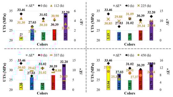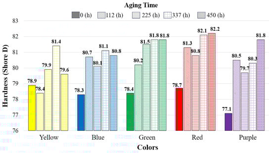 As the global 3D printing market continues to grow, the consumption of plastic products produced by 3D printers is also increasing. The role of 3D-printed products in both daily use and industrial applications has been progressively reinforced. Plastic materials undergo physical and chemical changes when exposed to environmental conditions such as temperature, light, and humidity. Consequently, they are subjected to aging during use, which shortens their service life. With the expanding use of 3D printing technology in various sectors such as healthcare, automotive, aerospace, and defense, it has become increasingly important to understand the changes (potential decreases or losses) in the performance of these materials after long-term exposure to environmental conditions. This study aims to contribute to the understanding of potential changes in 3D-printed ABS Plus material by examining the phenomenon of aging induced by exposure to radiation from a xenon arc lamp. ABS Plus samples of different colors (yellow, purple, red, green, and blue) were subjected to aging for 0, 112, 225, 337, and 450 h using a xenon arc lamp. To investigate the effects of aging, the mechanical (tensile, flexural, and hardness) and optical (color and gloss variations) properties of the samples were compared before and after aging. Following the mechanical tests, the fracture modes of the specimens were also examined. In addition, Scanning Electron Microscope (SEM) images were obtained to further discuss the effects of aging. The results revealed that the mechanical properties of the reference samples varied depending on color. The highest tensile strength was observed in the yellow samples (33.46 MPa), while the highest flexural strength was recorded in the green samples (58.46 MPa). After aging, the lowest tensile strength was found in the purple samples aged for 337 h (24.63 MPa), whereas the lowest bending force was measured in the red samples aged for 450 h (45.27 N). Overall, the mechanical properties of the samples varied with aging duration, with the blue and green specimens being the least affected. For the blue specimens, after 112, 225, and 337 h of aging, an increase in tensile strength was observed (2.77%, 10.54%, and 9.58%, respectively), while a decrease occurred after 450 h of aging (−6.22%). For the green specimens, after 112, 225, and 337 h of aging, the tensile strength remained similar to that of the reference sample (−2.97%, 0.23%, and 0.05%, respectively) but decreased after 445 h of aging (−8.09%). In terms of optical properties, the most significant color change (−23.51) was observed in the purple samples. Gloss measurements indicated that the impact of aging increased with exposure time.