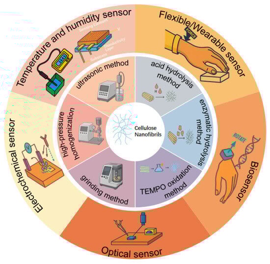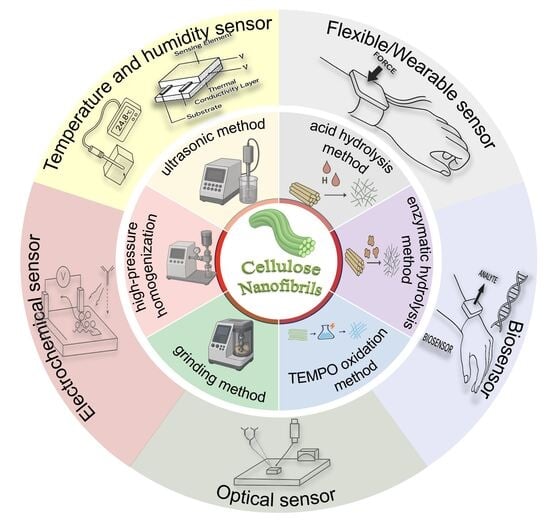 Cellulose nanofibrils (CNFs) provide a green scaffold for next-generation flexible sensors. They unite abundance, mechanical robustness, biocompatibility, and an easily engineered surface. This review synthesizes advances from the past five years in low-carbon CNF manufacturing. We cover biomass pretreatment, high-solid mechanical fibrillation, and