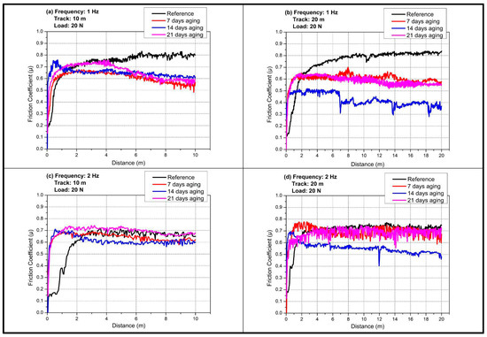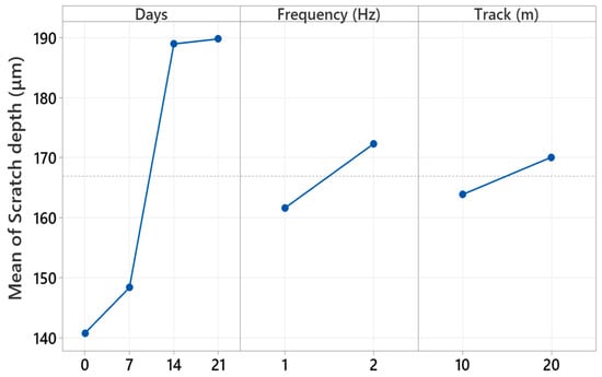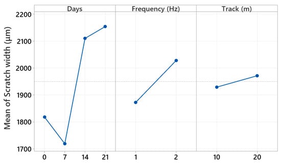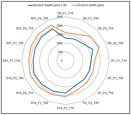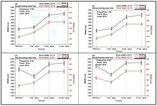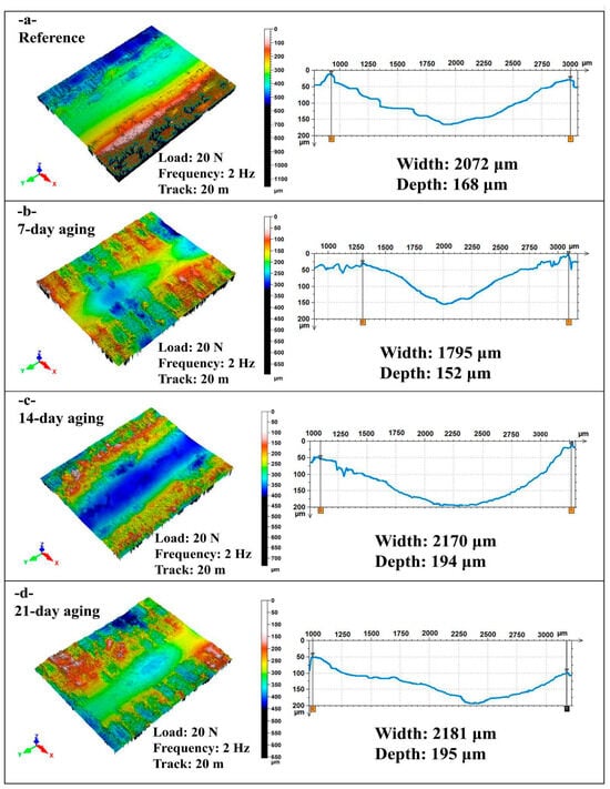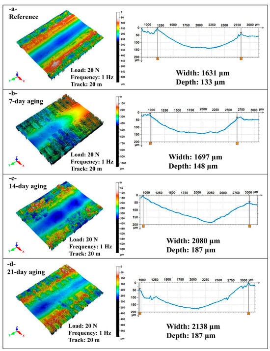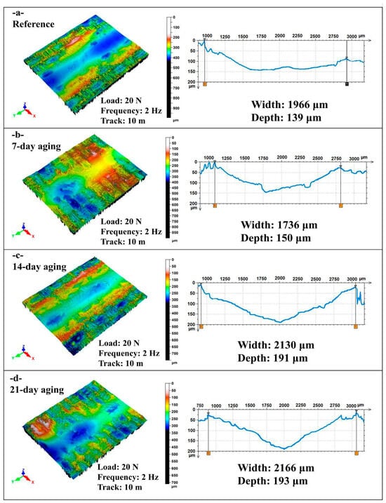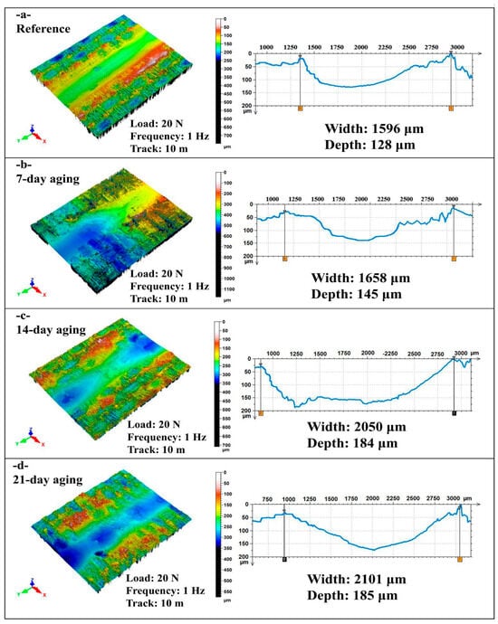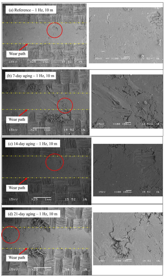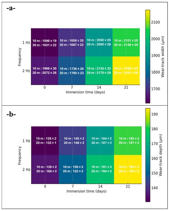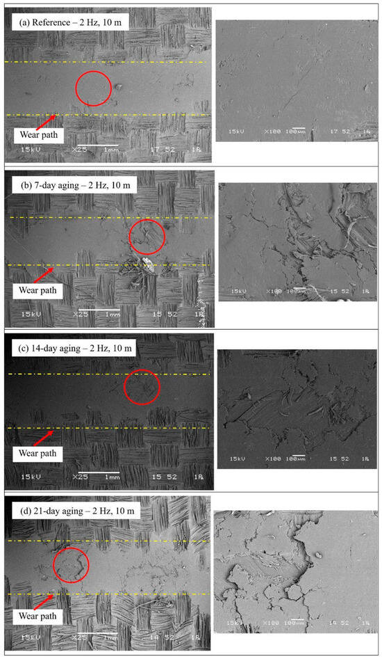 This study quantifies how pressurized water immersion alters the reciprocating sliding behavior of glass and Kevlar woven fabric-reinforced polymer hybrid composite laminates. Specimens were immersed in deionized water at 10 bar and 25 °C for 0, 7, 14, and 21 days, then tested against a 6 mm 100Cr6 steel ball at 20 N under four regimes that combine 1 or 2 Hz with 10 m or 20 m total sliding. Water uptake rose from 0 to 8.54% by day 21 and followed a short-time Fickian square root of time trend, indicating diffusion-controlled sorption. The coefficient of friction exhibited a robust nonmonotonic response with a pronounced minimum at 14 days that was typically 20 to 40% lower than the unaged reference across frequencies and distances, while 7 days produced a partial decrease and 21 days trended upward. Three-dimensional profilometry showed progressive widening and deepening of wear tracks with immersion, for example, at 1 Hz and 10 m width increased from about 1596 to about 2050 to 2101 μm and depth from about 128 to about 184 to 185 μm, with a transient narrowing at 2 Hz after 7 days. Scanning electron microscopy corroborated a transition from mild plowing to matrix plasticization with fiber–matrix debonding and debris compaction. Beyond geometric wear metrics, this study re-processed the existing profilometry and COF records to derive a moisture-dependent mechanistic approach. Moisture uptake up to 8.54% reorganizes the third body at the interface so that friction drops markedly at 14 days (typically 20–40% below the unaged state), while concurrent matrix plasticization and interface weakening enlarge the wear cross-section extracted from the same 3D maps, decoupling friction from damage width/depth under wet conditioning. Factorial analysis ranked immersion time as the dominant driver of damage for width and depth with frequency as a secondary factor and sliding distance as a minor factor, highlighting immersion-controlled tribological design windows for marine and humid service.